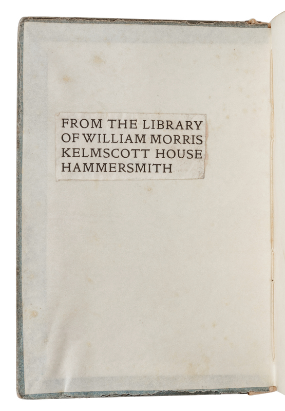 16mo (145 x 102 mm). Printed in Golden type in black and red, 6-line and 40-line initial capitals, title-page printed in red and black, shoulder notes printed in red. Original holland-backed blue paper boards, printed title on upper cover, uncut (spine ends slightly frayed, some minor soiling or spotting to covers, spine, and fore-edge, hinges loose, vellum pastedowns slightly lifting at edges). Provenance: William Morris (signed and dated "William Morris Nov: 9th 1893" on second blank leaf, his Kelmscott House Hammersmith bookplate).