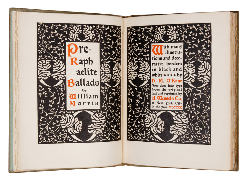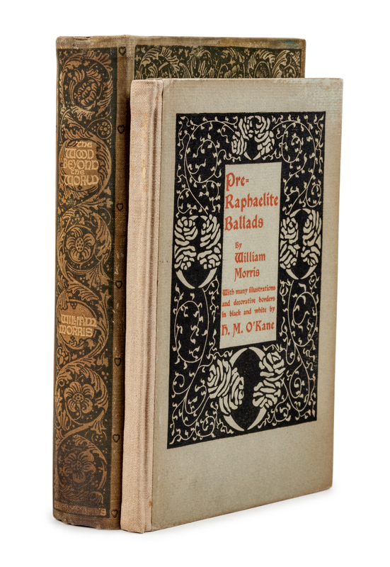 Pre-Raphaelite Ballads. New York: A. Wessels Co., 1900. Text printed in red and black within wide decorative borders, illustrations and initials by K. M. O'Kane. Original tan linen-backed green printed boards (some light soiling or staining). LIMITED EDITION, number 181 of 500 copies on "Old Stratford" paper. -- The Wood Beyond the World. Boston: The Roberts House, 1895. Publisher's green decorated cloth gilt, top edge gilt, others uncut (some soiling and staining). LIMITED EDITION, one of 500 unnumbered copies.
