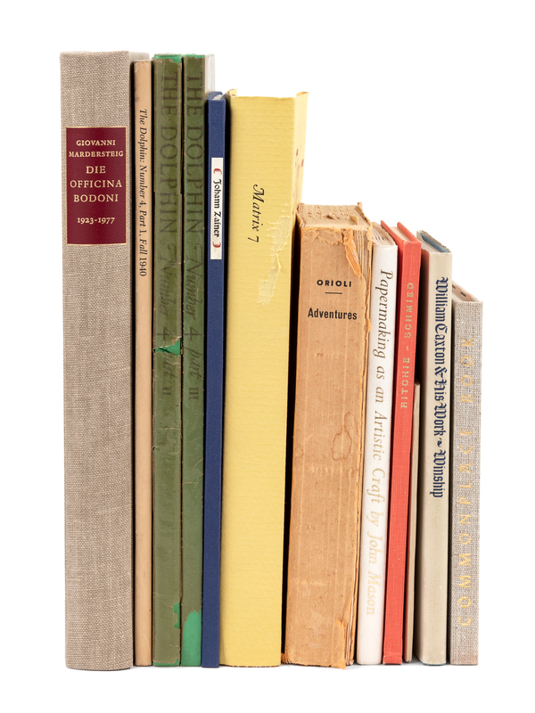 WINSHIP, George Parker. William Caxton & His Work. Berkeley: The University of California Press for the Book Arts Club, 1937. Original cloth; original printed dust jacket. One of 525 copies. -- The Dolphin. Fall 1940. No. 4, parts 1-3. New York: The Limited Editions Club, 1940. 3 volumes, 4to. Part 1: original printed wrappers; parts 2 and 3: original cloth; glassine. -- WAGNER, Henry R. Collecting Especially Books. Los Angeles: Gregg Anderson for the Rounce & Coffin Club, 1941. 12mo. Original printed wrappers. One of 30 copies. -- A Commonplace Book for Typophiles. San Francisco: Grace Hoper Press for the Typophiles, 1961. 12mo. Original cloth-backed printed boards; glassine. One of 360 copies. -- MASON, John. Paper Making as an Artistic Craft. Leicester: Twelve by Eight Press, 1963. 8vo. Original printed wrappers. SIGNED BY MASON. -- RITCHIE, Ward. François-Louis Schmied. Artist Engraver Printer. Tucson: Graduate Library School and University Library of the University of Arizona Tucson, 1976. 8vo. Original cloth with printed label to upper cover. One of 750 copies. -- MARDERSTEIG, Giovanni. Die Officina Bodoni. Hamburg: Maximilian-Gesellschaft, 1979 4to, original cloth. One of 1500 copies. -- AMELUNG, Peter. Johan Zainer. The Elder & Younger. Los Angeles: Patrick Reagh for Kenneth Karmiole, Bookseller, Inc., 1985. 4to. Original leaf from Hugo Ripelin’s Compendium Theologiae Veritatis (ca 1478-81) printed by Johan Zainer laid in. Original cloth. One of 159 copies. -- Matrix 7. No. 7, Winter 1987. Andoversford, Gloucestershire: The Whittington Press, 1987. 4to. Original boards; printed dust jacket. One of 960 copies. Original prospectus for Matrix 8 laid in. -- ORIOLI, G. Adventures of a Bookseller. Florence: Privately printed by G. Orioli, n.d. 8vo. Original printed wrappers (upper cover detached). Number 196 of 300 copies. SIGNED BY ORIOLI.