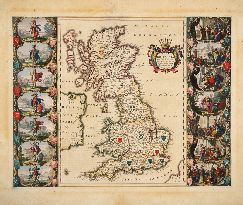 Engraved map of Britain, text on verso in Latin, sheet 20 x 23 3/8 in. (508 x 594 mm) with hand-coloring. (Some marginal staining from old matting, a few small mostly marginal spots.) Wide side borders decorated with 14 historiated scenes of the Saxon kingdoms including the shield of each kingdom.