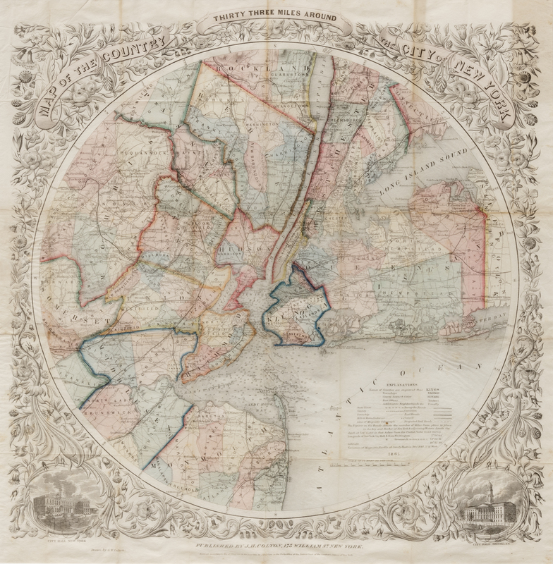 “First issued in 1846, when it was re-engraved by Atwood from J. H. Eddy's "Map of the Country Thirty Miles round the City of New York" which was originally issued in 1811. This is one of Colton's most attractive maps, showing New York and vicinity in circular format surrounded by a vine border with views of City Hall, New York and City Hall, Brooklyn. It was published in many editions for almost fifty years… The early editions were engraved on copper plate and at some point before [this] 1865 edition the copper plate was transferred to lithographic stone and all subsequent editions were lithographed” (Rumsey). The present map with “1865” added on the stone, and with many additional railroads added since the 1853 edition. See Haskell 910-915a; Rumsey 4784.002.
