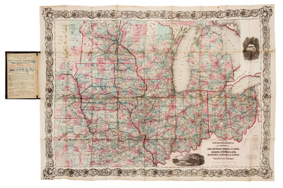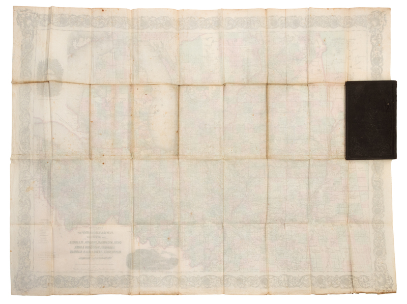 Engraved folding map hand-colored in wash and outline, sheet 21 6/8 x 29 1/8 in. (552 x 741 mm). (A few separations at folds, some minor browning, very light marginal chipping lower left, contemporary outline in red and blue crayon delineating finished and projected roads and the Central Railroad of Iowa with a manuscript key on printed advertisements.) Bound in original gilt- and blind-stamped brown cloth covers, printed advertisements to upper pastedown. RARE.