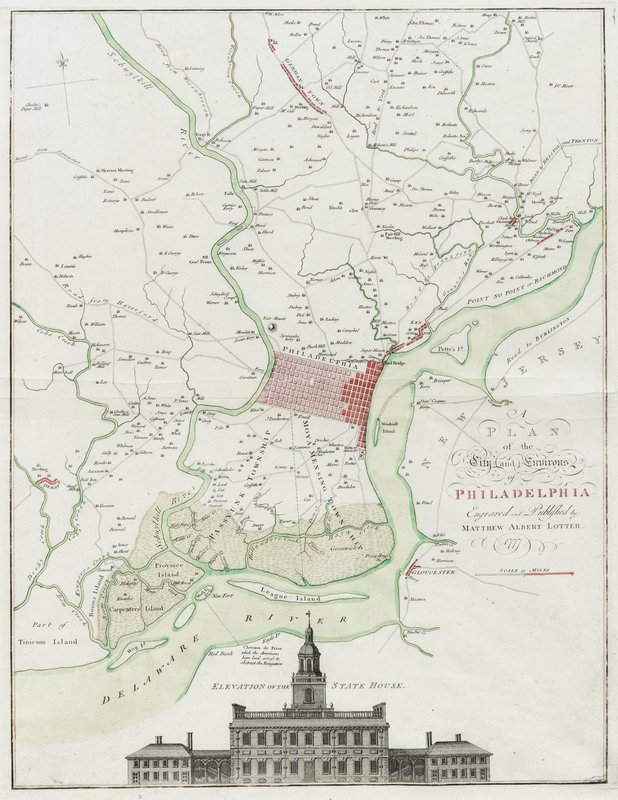 A fine example of Lotter's edition after Nicholas Scull & George Heap's seminal Philadelphia map first published in London by Faden the same year. Nebenzahl, Bibliography of Battle Plans of the American Revolution 131; Tooley, The Mapping of America 132 & p. 214.