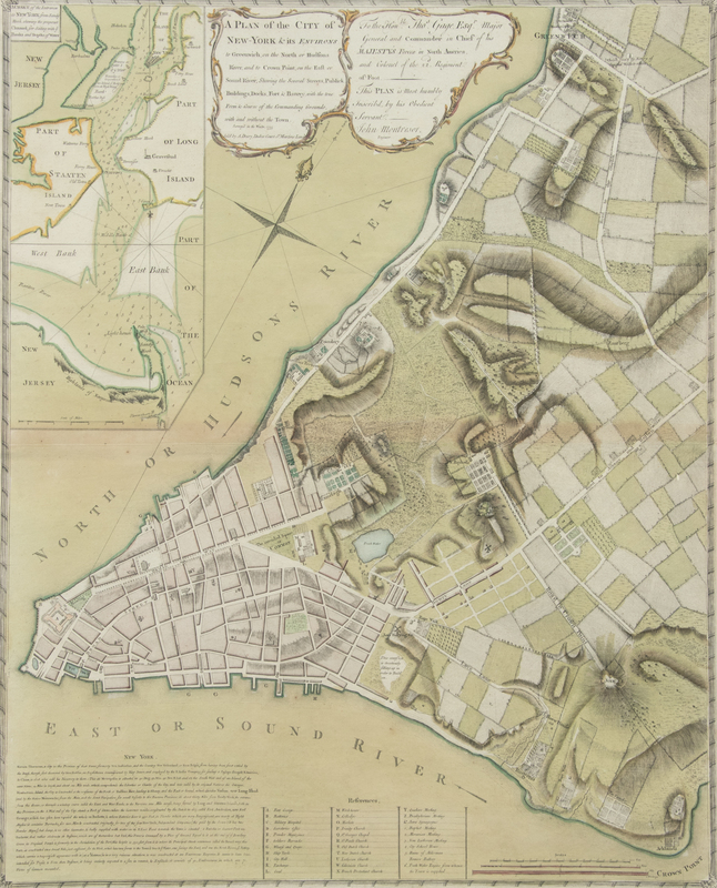 RARE MONTRESOR PLAN OF NEW YORK CITY, second issue, with the altered survey date and the added Dury imprint. Issued just after the start of the Revolutionary War, the map is identical to the first issue except with the spurious statement added "Survey'd in the Winter, 1775,” when it was in fact surveyed in 1765. The Montresor map is the most detailed and accurate map of New York and its surrounding areas published during the colonial period. Most significantly, it is the first detailed map of the island of Manhattan beyond the city, and presents its topography before development. It includes Greenwich Village, manors of wealthy New York families, the road system north of the city, as well as elevated areas which have since been leveled. It also includes an inset map of the larger area of New York Harbor and its islands. General Thomas Gage, commander-in-chief of the British Army America, ordered Lieutenant John Montresor to conduct a survey of New York and its surrounding area in December, 1765, wanting an accurate map of Manhattan in anticipation that it would soon become a battleground. Montresor conducted his survey during a time of heightened tension and violence between the British Army, which was headquartered in New York, and colonial civilians. Working amidst the chaos of the Stamp Act Riots and general unrest, he conducted his survey in secret. Cohen & Augustyn, Manhattan in Maps, pp. 70-72; Nebenzahl, Atlas of the American Revolution 11; Stevens-Tree 39b; NYPL 307.