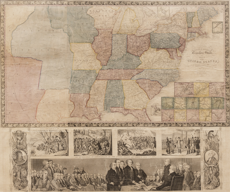 Hand-colored engraved map, visible area 26 x 31 in. (660 x 787 mm), matted and framed (unexamined out of frame). With vignettes at bottom depicting American historical scenes and portraits. (Overall cracking and abrasions with some small losses to image, customary for wall maps from use, age-toned, possibly mounted or previously mounted on linen).