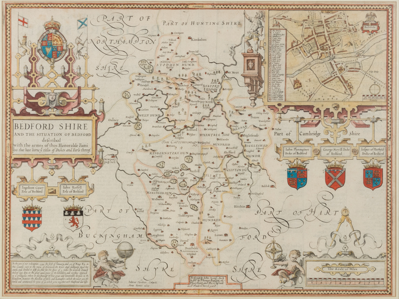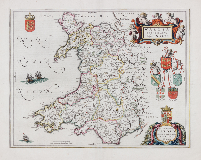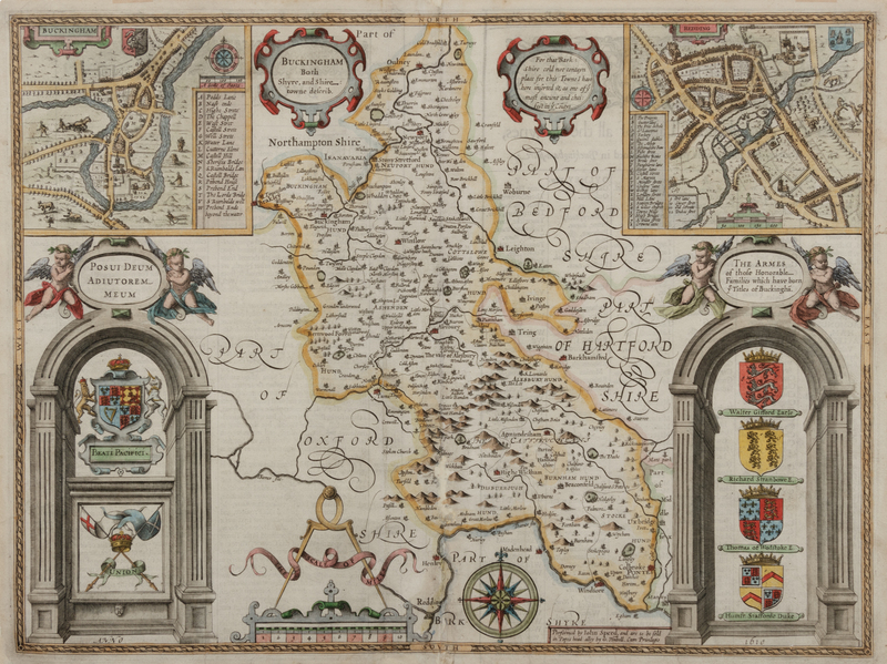 Buckingham Both Shyre, and Shire towne describ. London, ca 1610. -- Bedford Shire and the Situation of Bedford described. London, ca 1610. Matted, framed and glazed (unexamined out of frame). -- [With:] BLAEU, Johannes. Wallia Principatus Vulgo Wales. Engraved map with hand coloring in wash and outline. Latin text on verso.