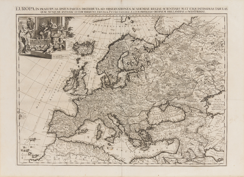 Engraved map of Europe, sheet 22 x 30 1/8 in. (558 x 767 mm sheet), matted and framed (not examined out of frame). Decorative cartouche, engraved by Jacob Baptist after Jan Goree, depicting Europe as a Queen surrounded by emblems symbolizing music, the arts, agriculture, and war. (A few tiny pinholes in blank area of the ocean, a few short tears to fold.)