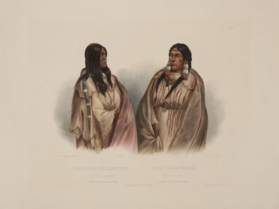 Woman of the Snake-Tribe | Woman of the Cree-Tribe (Plate 33). From Travels in the Interior of North America, Coblenz, Paris, and London, 1839-1842. Aquatint engraving with hand-coloring, Bodmer blindstamp lower margin, title in French, German and English, plate 14 1/4 x 18 1/2 in (17 1/2 x 24 1/4 in sheet), small crease lower margin, a few short marginal tears, some toning.