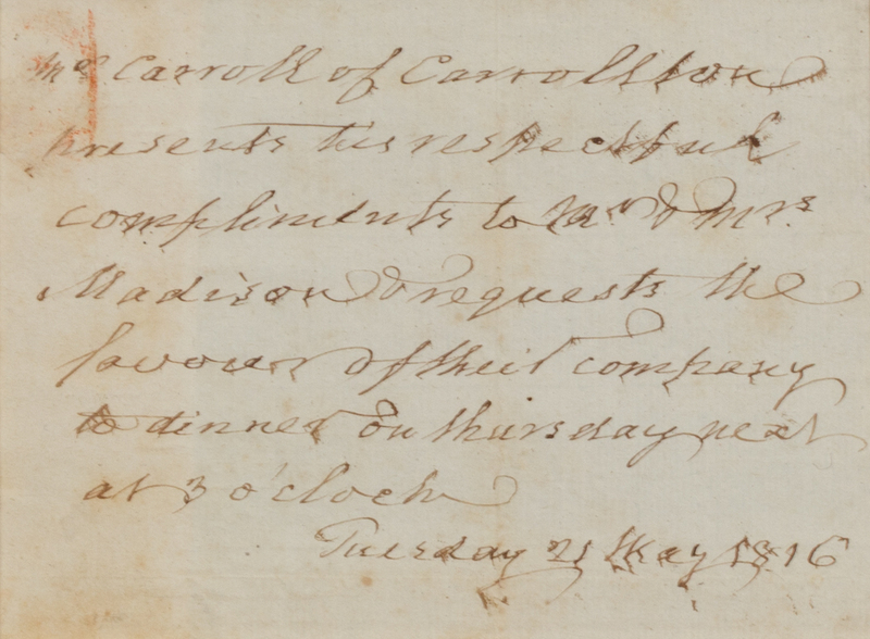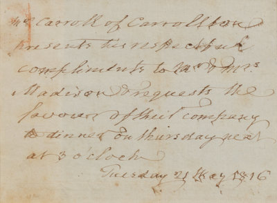 CARROLL, Charles (1737-1842), signer of the Declaration of Independence. Autograph note signed in text ("Mr. Carroll of Carrollton"), to Mr. and Mrs. Madison. N.p., 21 May 1816.