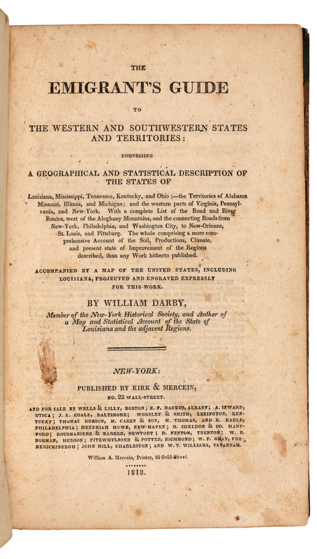 DARBY, William (1775-1854). The Emigrant's Guide to the Western and South-Western States and Territories. New York: Kirk & Mercien, 1818.