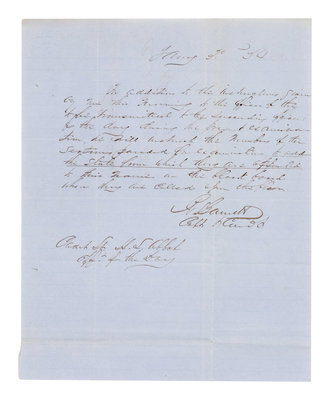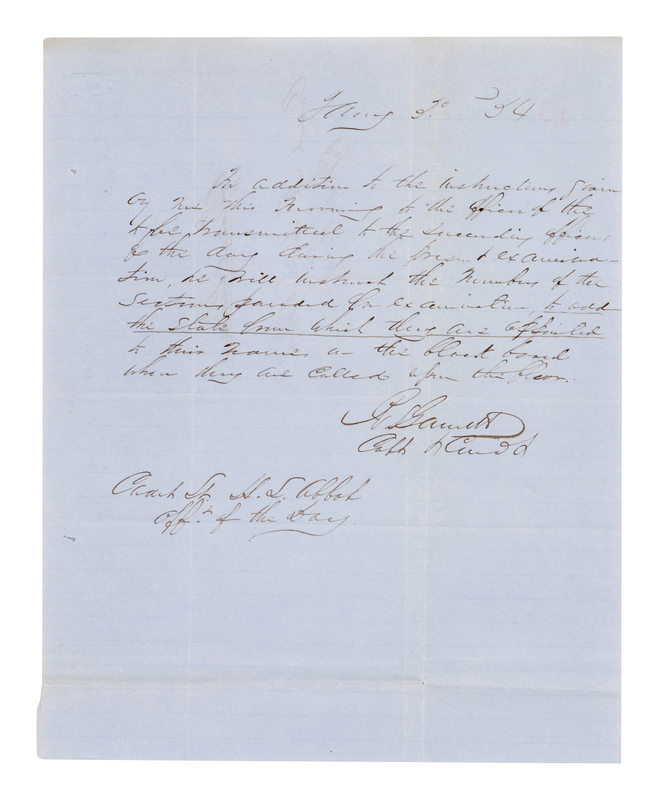 1 page, 4to, two pinholes to left margin, creased. Written to his Officer of the Day, Henry L. Abbott, who would later become brevet brigadier general. "[You] will instruct Members of the Sections paraded for examination to add the state from which they are appointed to their names on the black board when they are called upon the floor..."