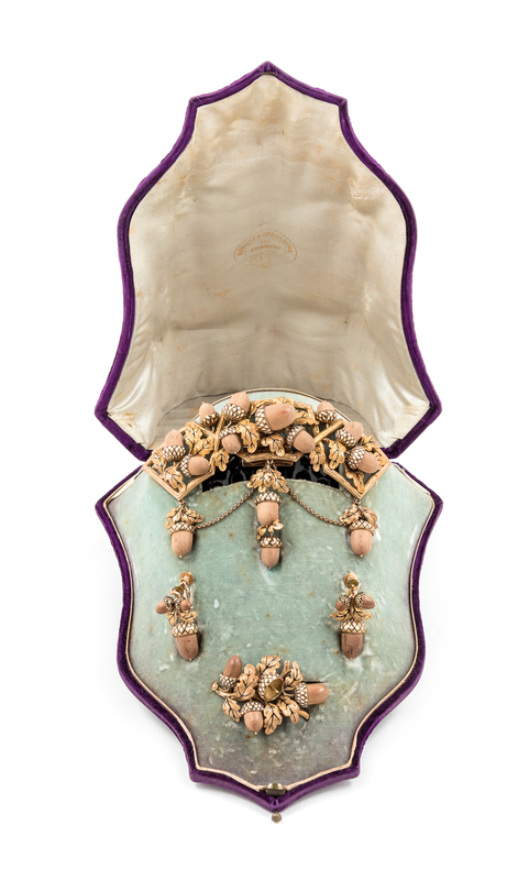 [GRANT, Ulysses S.— GRANT, Julia, First Lady]. Carved Applewood and 18-karat Gold Jewelry Suite, Browne & Spaulding, Jewelers, New York City, 1865.