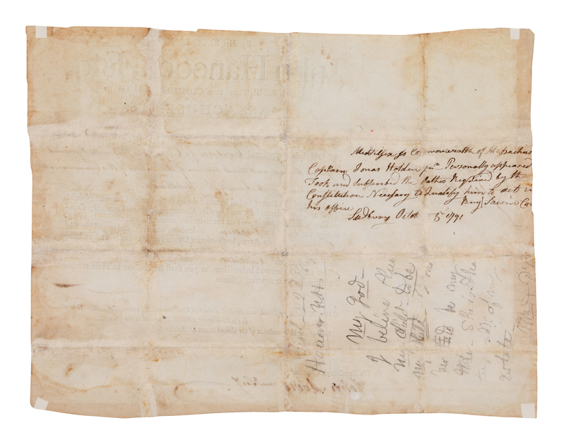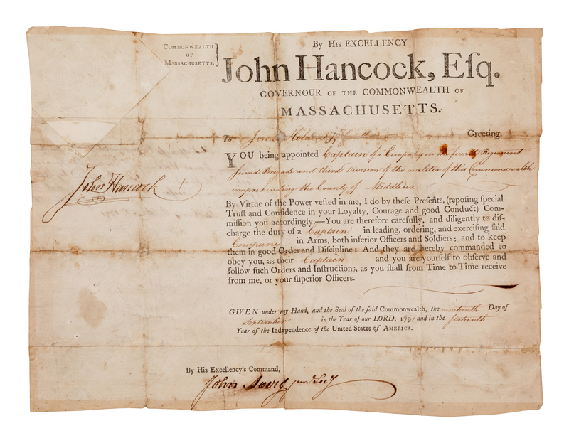 HANCOCK, John (1737-1793). Document signed ("John Hancock"), partially printed and accomplished in manuscript, as Governor of Massachusetts, counter-signed by John Avery Jr. as Secretary, docketed on verso by Benjamin Lawin,19 September 1791.