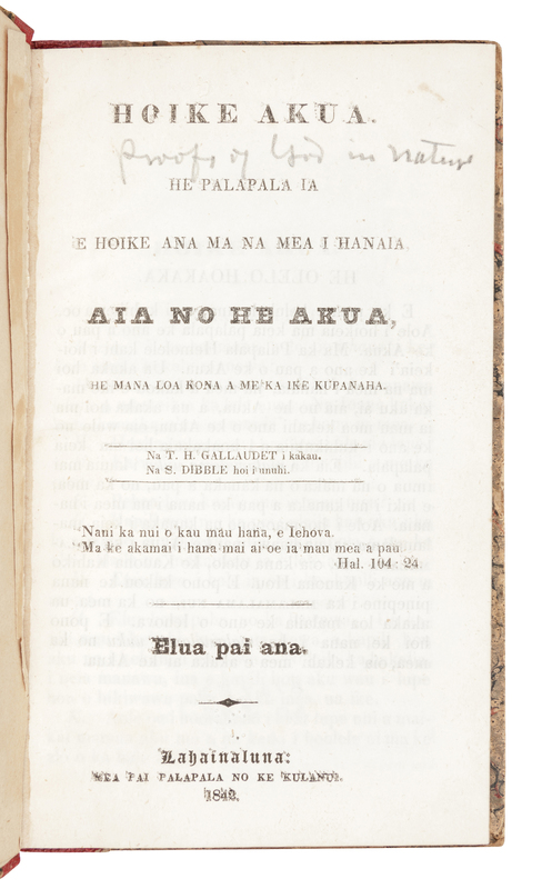 [HAWAIIAN IMPRINT - LAHAINALUNA]. GALLAUDET, Thomas Hopkins (1787-1851). Hoike Akua: he Palapala ia e hoike ana ma na mea i hanaia aia no he Akua. Lahainaluna: Wea pai Palapala no ke Kulanu, 1842.