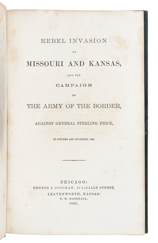 [HINTON, Richard J. (d. 1901)]. Rebel Invasion of Missouri and Kansas, and the Campaign of the Army of the Border against General Sterling Price. Chicago and Leavenworth, KS: Church & Goodman; T. W. Marshall, 1865.