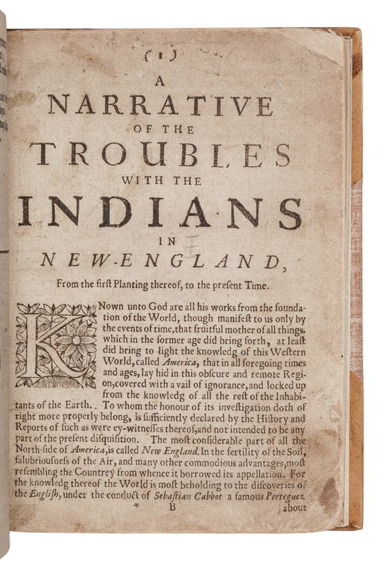 HUBBARD, William (1621?-1704). The Present State of New-England, being a Narrative of the Troubles with the Indians. London: for Tho. Parkhurst, 1677.