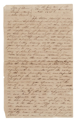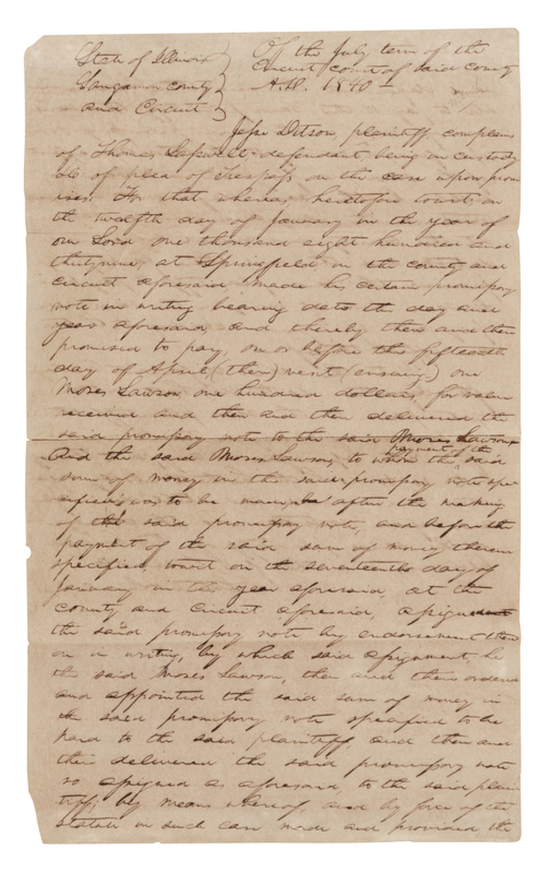 AN EARLY AND LENGTHY LEGAL DOCUMENT, ENTIRELY WRITTEN AND SIGNED BY LINCOLN DURING HIS FIRST LAW PARTNERSHIP. Lincoln is acting for the plaintiff, Jesse Ditson, and suing for the payment of a promissory note and damages from Thomas Lasswell. It reads in part: “Jesse Ditson, plaintiff, complains of Thomas Lasswell, defendant, being in custody &c. of plea of Trespass on the case upon promises. For that whereas, heretofore, to wit, on the twelfth day of January in the year of our Lord one thousand eight hundred and thirty-nine, at Springfield, in the county and circuit aforesaid, made his certain promissory note in writing bearing date the day and year aforesaid, and thereby and then promised to pay, on or before the fifteenth of April, (then) next (ensuing) one Moses Lawson, one hundred dollars, for value received, and then and there delivered the said promissory note to the said Moses Lawson…” Containing approximately 570 words in Lincoln’s hand.