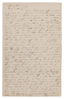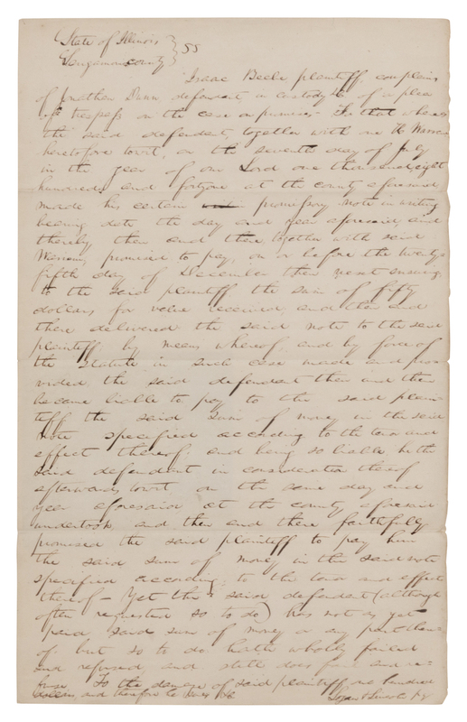 A LEGAL PLEA WRITTEN ENTIRELY IN LINCOLN’S HAND DURING HIS SECOND LAW PARTNERSHIP. Complaint written by Lincoln, while a legal partner with Stephen T. Logan, on behalf of the plaintiff, Isaac Beebe, against the defendant Jonathan Dunn, for the recovery of the amount due on a promissory note. Containing approximately 280 words in Lincoln’s hand.