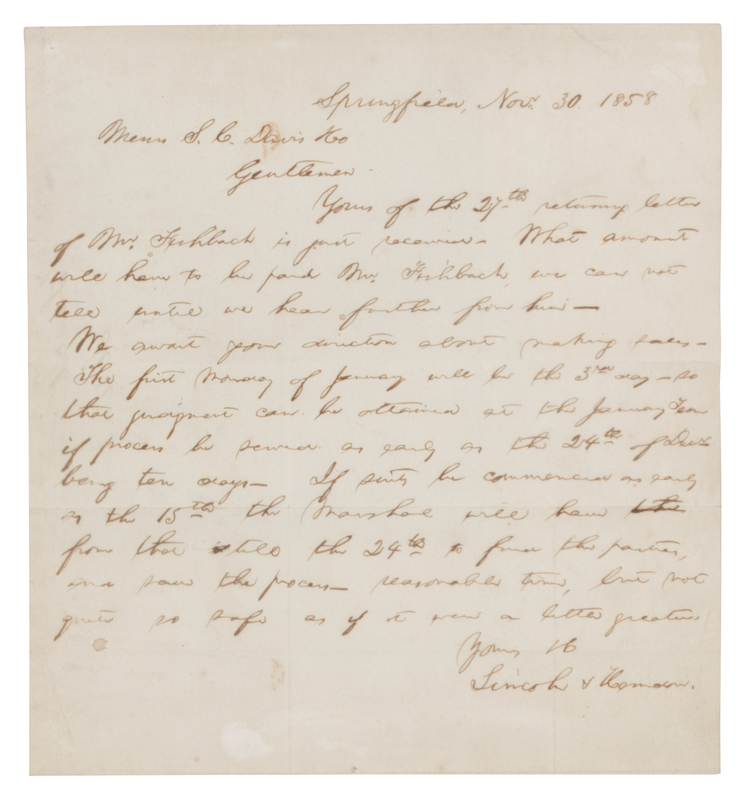 Written during his final and most famous legal partnership with William Herndon, Lincoln advises Samuel C. Davis & Co. regarding foreclosures and property the company had been awarded in a case handled by their firm.