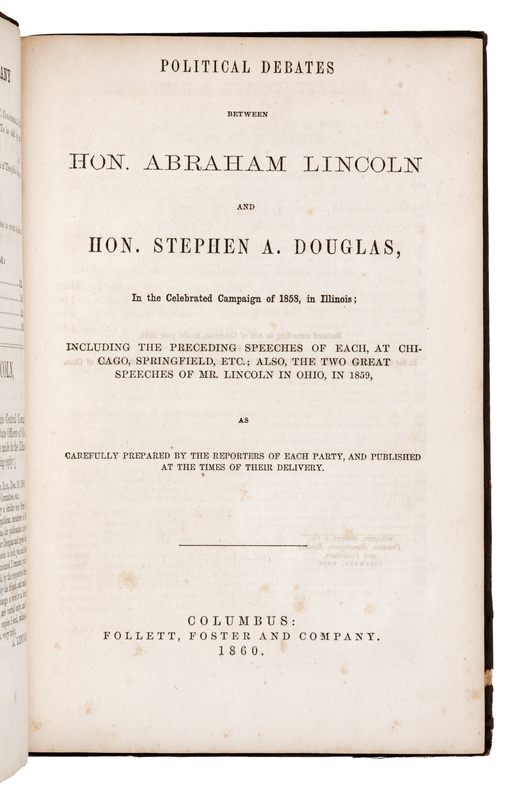 [LINCOLN-DOUGLAS DEBATE]. LINCOLN, Abraham (1809-1865). Political Debates between Hon. Abraham Lincoln and Hon. Stephen A. Douglas. Columbus: Follett, Foster, and Company, 1860.