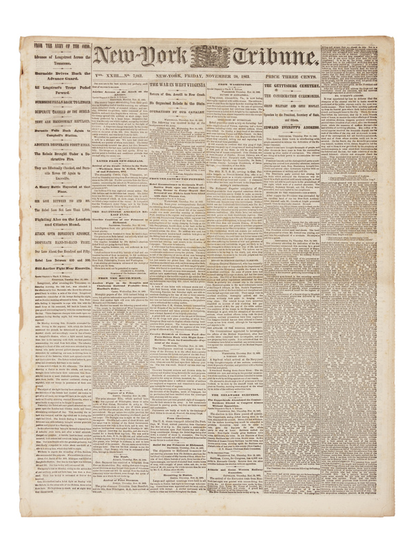 Issued less than a day after Lincoln delivered his most memorable speech at the National Cemetery in Gettysburg. The Tribune had a circulation of about 200,000, therefore a large segment of the population got their first reading of the speech through this paper. The headline on the fifth column, above the fold, reads: "The Gettysburg Cemetery. The Consecration Ceremonies. Grand Military and Civic Display. Speeches by the President, Secretary of State and Others. Edward Everett's Address." Lincoln's short, but eloquent remarks begin at the bottom of the column and conclude at the top of the adjoining column. The paper also prints news of fighting near Knoxville, Tennessee and other theaters of operation. The first appearances of the Gettysburg Address in print were in several morning newspapers issued on 20 November 1863, without an exact priority established. Carbonell, Gettysburg Address 1.