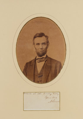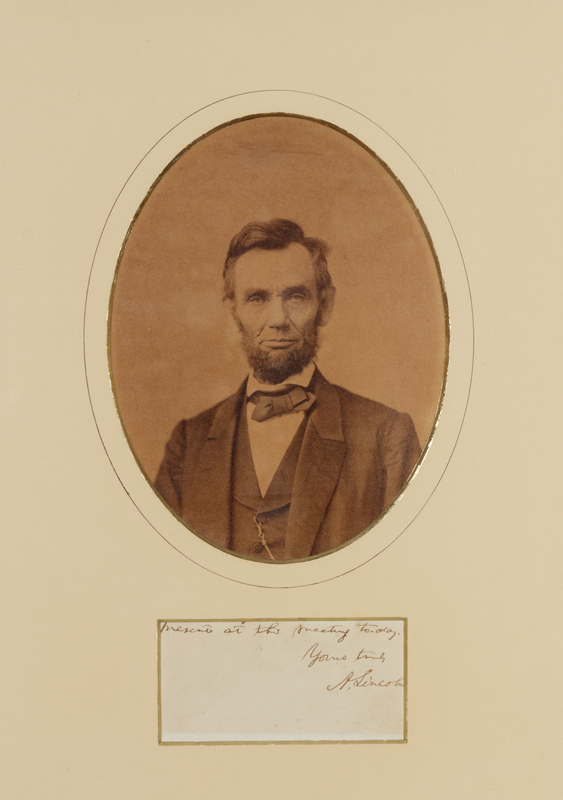On a small sheet (52 x 105 mm), matted, framed and glazed (unexamined out of frame). Letter closing reads: “…present at the meeting today. / Yours truly / A. Lincoln.” Matted with an oval albumen photograph portrait by Alexander Gardner (mounted, slight blistering).