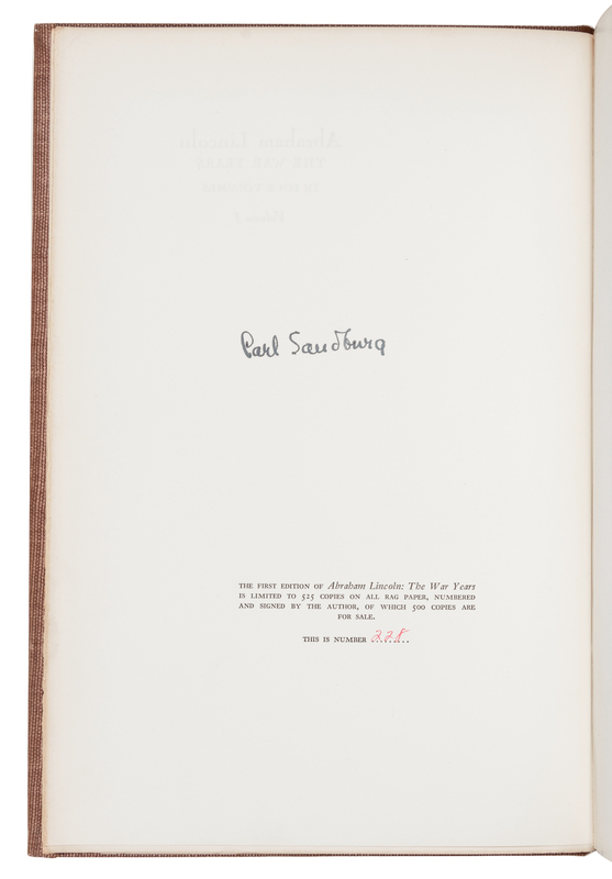 [LINCOLN, Abraham]. SANDBURG, Carl (1878-1967). Abraham Lincoln: The War Years. New York: Harcourt, Brace & Company, 1939.