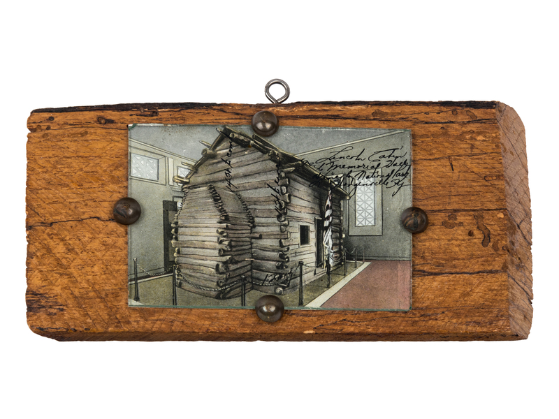 Approximately 100 x 200 x 15 mm. Small postcard of Lincoln Cabin at Lincoln National Park in Hodgenville, KY, mounted under glass with brass tacks on front, hook at top. Printed paper label on back: "This 'Wood' is from the Lincoln Farm. Birthplace of Abraham Lincoln. By Ladies Lincoln League. For Library Fund. Hodgenville, Ky."