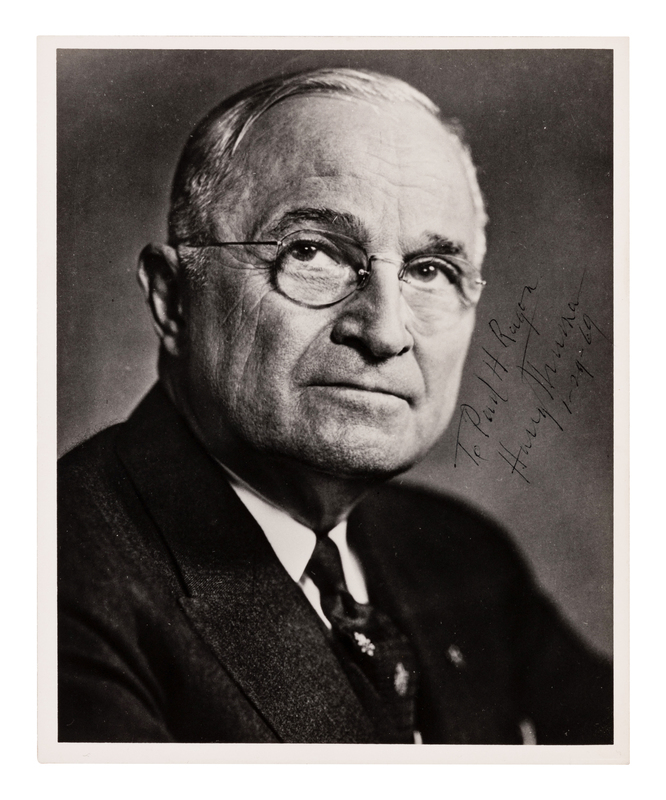 TRUMAN, Harry S. (1884-1972), President. Photograph signed and inscribed ("Harry Truman"), to Paul H. Ragon. N.p., January 29, 1969.