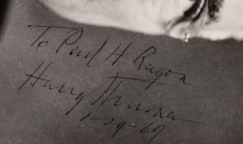 8 x 10 in black and white photograph, signed and inscribed right margin. "To Paul H. Ragon Harry Truman."