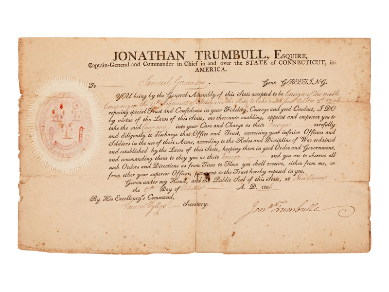 1 page, small folio, bifolium, separations along creases repaired verso, some spotting. With the embossed paper seal of the state of Connecticut. Appointing Samuel Guernsey Ensign of the ninth Company in the 17th regiment of the Connecticut Militia, effective October 2nd, 1806.