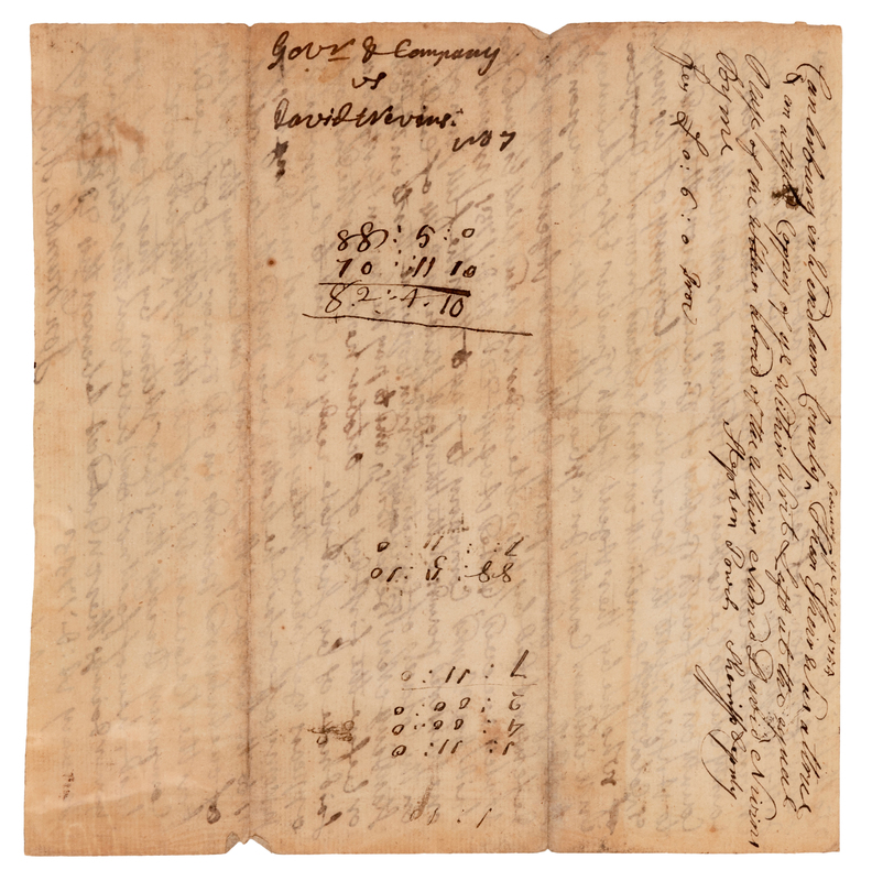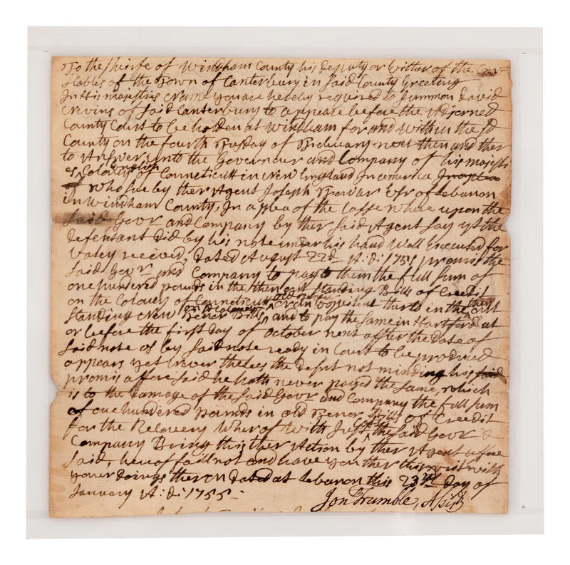 Approximately 6 x 6 in., possibly cut from a larger document, tears to folds expertly repaired verso, 3 lines in a different hand verso, docketed on verso. Summoning David Nevins to appear before the county court "to recover of the Defendant the...sum of nine pounds lawful money" owed to the "Governor and Company."