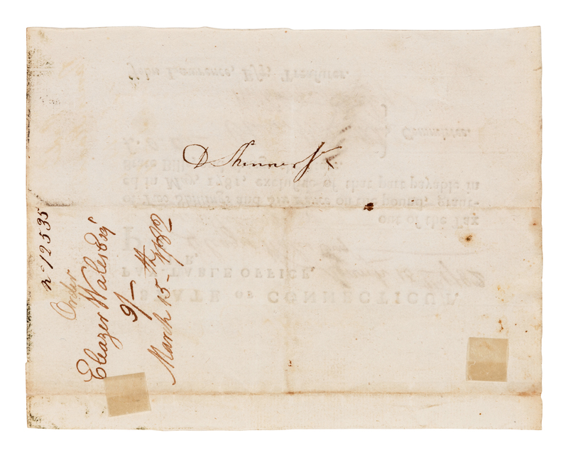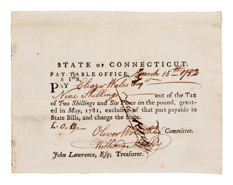 1 page, oblong 8vo, countersigned over Wolcott's signature, docketed verso, creased. Granting payment of nine shillings to Eliazer Wales.