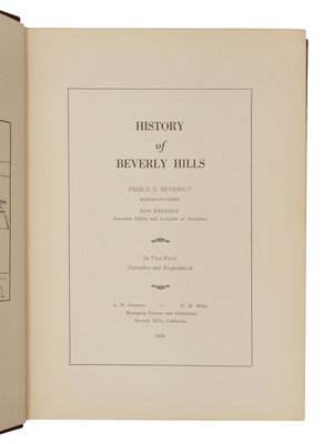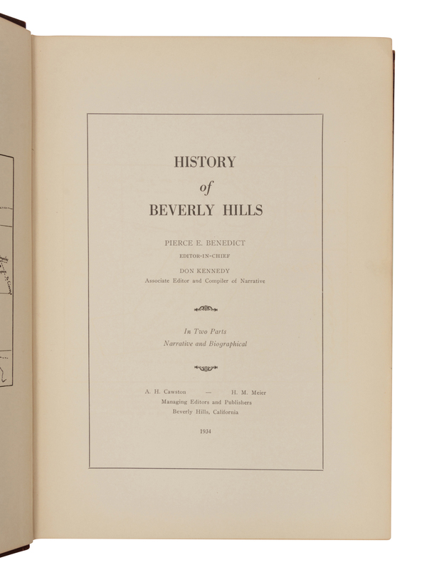 BENEDICT, Pierce E., editor (1856-1937). History of Beverly Hills. Beverly Hills, CA: A. H. Cawston and H. M. Meier, 1934.