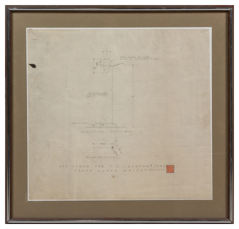 3 original finished architectural drawings in pencil, titled lower margin: "Mezzanine Office Allotment," unframed; "'Electroliers' for Carport," unframed; "Ash Stand," matted, framed, and glazed (unexamined out of frame). Each hand-lettered lower margin "Frank Lloyd Wright Architect" with his square (colored red in "Ash Stand" drawing).