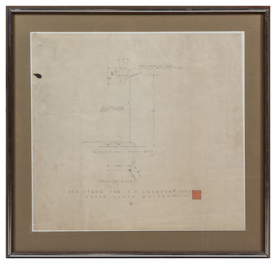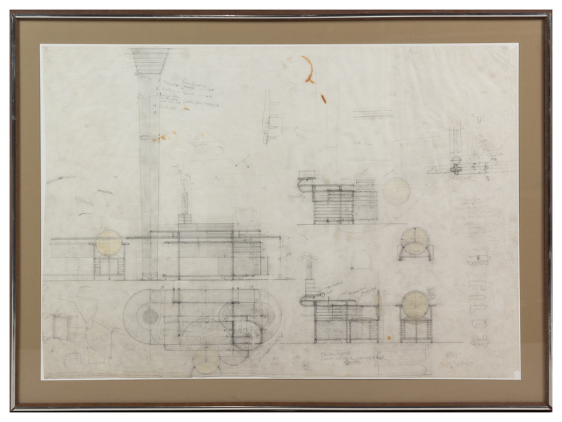 2 original architectural drawings in pencil, presumably drafts, titled lower margin: "Space Allotment Ground Plan," unframed; "Triplicate cantilever office desk," matted, framed and glazed (unexamined out of frame). Both unsigned, presumably by a member of Wright's firm.
