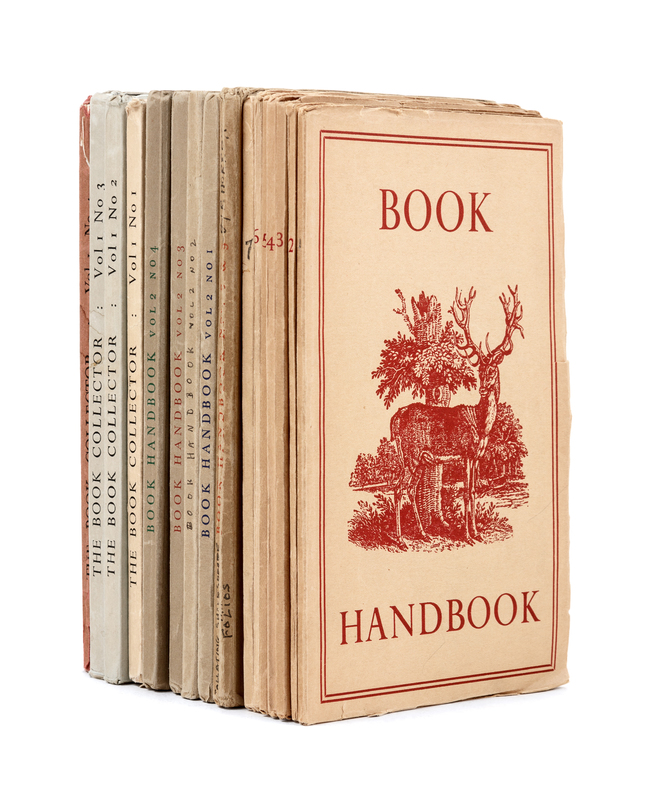 [BOOKS ABOUT BOOKS]. The Book Handbook: An Illustrated Quarterly for Owners and Collectors of Books. Vol. I, Nos. 1-8/9, Vol. II, Nos. 1-4, plus 1947 supplement. London: Vol. I: The Book Centre; Vol. II: The Dropmore Press Limited, 1947-1952. Reginald Horrox, editor. -- [Continued as]: The Book Collector. Vol. I Nos. 1-4. London: The Queen Anne Press Ltd., 1952.