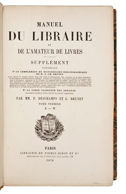 [Uniformly bound with:] Manuel du libraire et de l'amateur de livres Supplément. Paris: Librairie de Firmin-Didot et Cie, 1878, 1880. 2 volumes, 8vo.