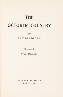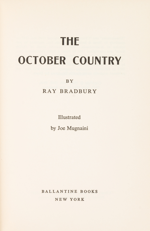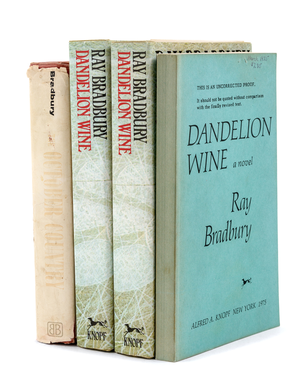 Dandelion Wine. An uncorrected proof of the Knopf edition. New York: Alfred A. Knopf, 1975. Original printed wrappers. -- Dandelion Wine. New York: Alfred A. Knopf, 1975. Publisher's presentation copy of the first Knopf edition with publisher's compliment slip and TLS explaining the re-issue: "When Dandelion Wine was first published in 1957, it sold just over 11,000 copies. Bantam now has 1,194,700 paperback copies in print. A popular success, the book has never been recognized as the classic we believe it to be." Publisher's green cloth, dust jacket. -- Another copy (without the compliment slip and TLS). -- The October Country. New York: Ballantine Books, 1955. FIRST EDITION. Currey p.57 (Binding B, 1st state); Nolan p.130 (1). -- Together 4 works in 4 volumes, condition generally fine.