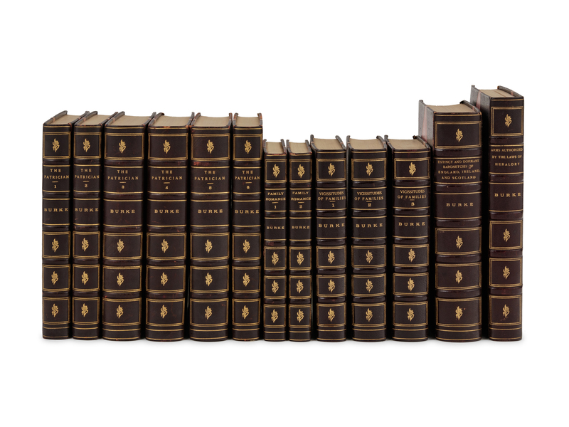 A Genealogical and Heraldic History....of England, Ireland, and Scotland. London: John Russell Smith, 1844. Second edition. -- The Patrician. London: E. Churton, 1846-1848. 8 volumes. -- Family Romance. London: Hurst and Blackett, 1854. 2 volumes. Second edition. -- Vicissitudes of Families. London: Longman, Green, Longman, and Roberts, 1860-1863. 3 volumes. Fourth edition. -- A Selection of Arms Authorized by the Laws of Heraldry. London: Harrison, 1860. -- Together, 5 works in 15 volumes, most later editions, uniformly bound in contemporary half black morocco gilt, edges gilt, condition generally fine.
