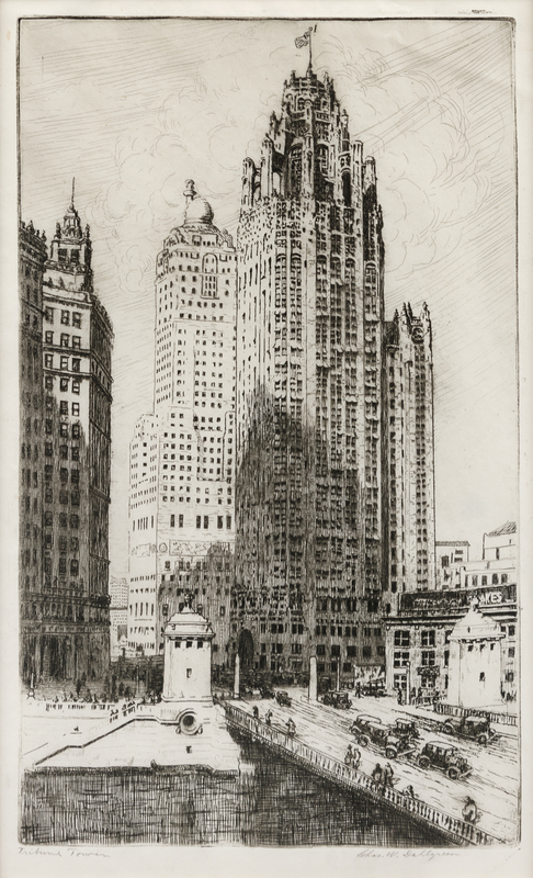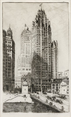 Adams Street Bridge. -- Art Institute. -- Blackstone Hotel. -- Chicago River #4. -- Chicago River Looking Eastward. -- Chicago River. -- Across the Lagoon. -- Tribune Tower. -- Largest image 9 1/4 x 15 1/8 in. All matted and framed (unexamined out of frame).