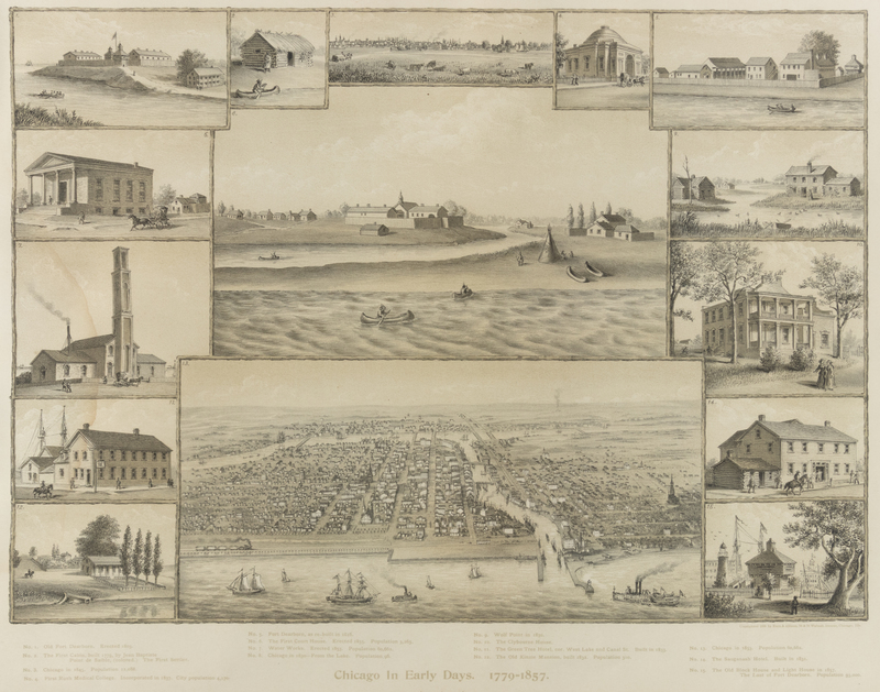 Depicting important sites in Chicago before the Great Chicago Fire, including Old Fort Dearborn (1803), First Rush Medical College (1837), the First Court House (1835), the Water Works (1853), Wolf Point (in 1830), and the Sauganash hotel (1831).
