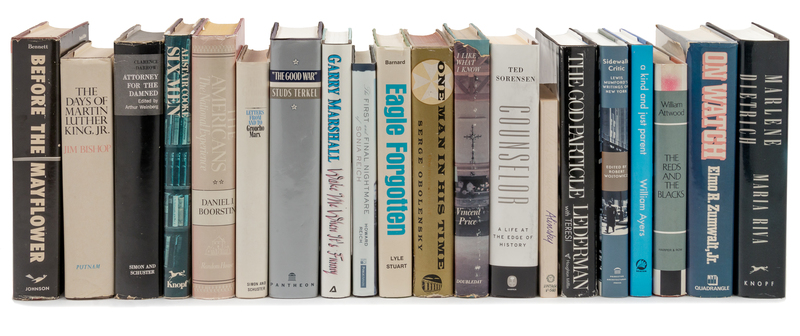 ATTWOOD, William. The Reds and the Blacks. New York, Evanston and London: 1967. FIRST EDITION. -- BARNARD, Harry. Eagle Forgotten. Secaucus, New Jersey: 1938. -- BENNETT, Lerone, Jr. Before the Mayflower: A History of the Negro in America 1619-1966. Chicago: 1966. -- BISHOP, Jim. The Days of Martin Luther King., Jr. New York: 1971. -- BOORSTIN, Daniel J. The Americans: The National Experience. New York: 1965. FIRST EDITION, FIRST PRINTING. -- COOKE, Alistair. Six Men. New York: 1977. -- MARSHALL, Garry and Lori MARSHALL. Wake Me When It’s Funny. Holbrook, MA: 1995. FIRST EDITION. -- MARX, Groucho. The Groucho Letters. New York: 1967. FIRST EDITION, FIRST PRINTING. -- OBOLENSKY, Serge. One Man In His Time. New York: 1958. -- RIVA, Maria. Marlene Dietrich. New York: 1993. FIRST EDITION. -- SORENSEN, Ted. Counselor: A Life at the Edge of History. New York: 2008. FIRST EDITION, FIRST PRINTING. -- TERKEL, Studs. "The Good War”: An Oral History of World War Two. New York: 1984. FIRST EDITION. -- WEINBERG, Arthur, editor. Attorney of the Damned. New York: 1957. FIRST EDITION, FIRST PRINTING. -- WOJTOWICZ, Robert, editor. Sidewalk Critic: Lewis Mumford’s Writings on New York. New York: 1998. FIRST EDITION. -- ZUMWALT, Elmo R., Jr. On Watch. New York: 1976. -- And 51 others. Together, 66 works in 66 volumes, many FIRST EDITIONS, most signed or inscribed, most in original publisher’s bindings, condition generally fine, complete list available on request.