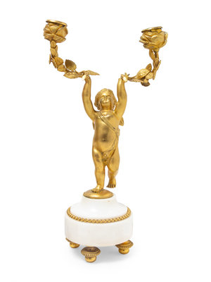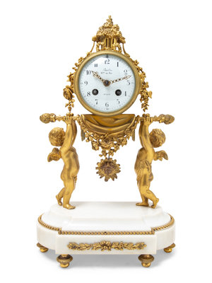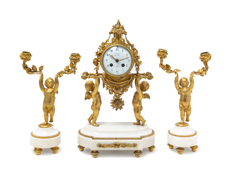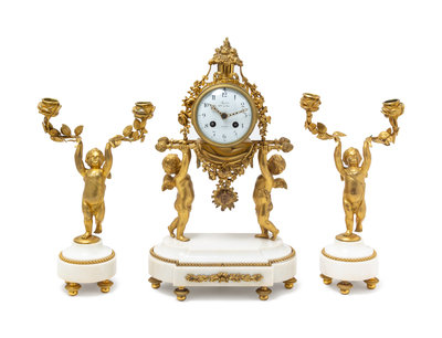 A Louis XVI Gilt Bronze and Marble Three-Piece Clock Garniture