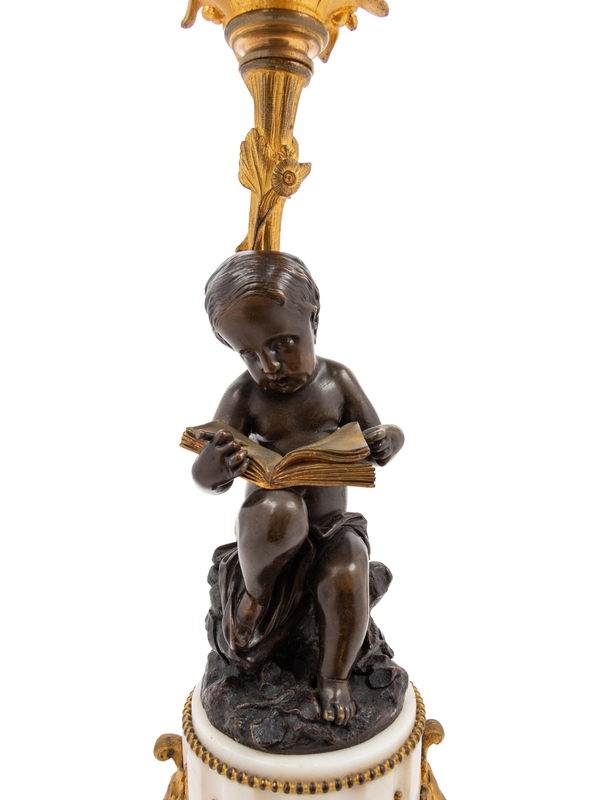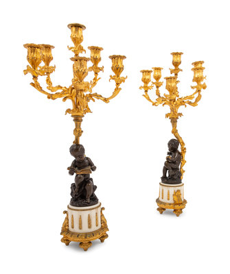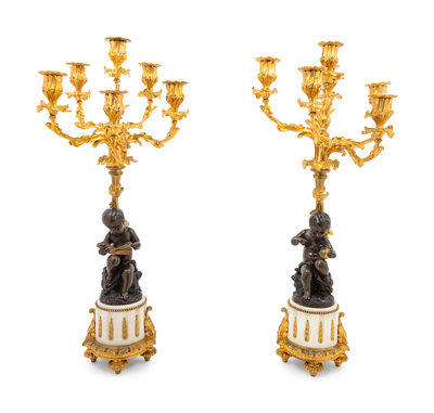 A Pair of Louis XVI Style Gilt and Patinated Bronze Figural Seven-Light Candelabra
