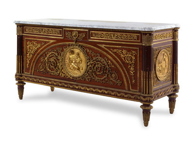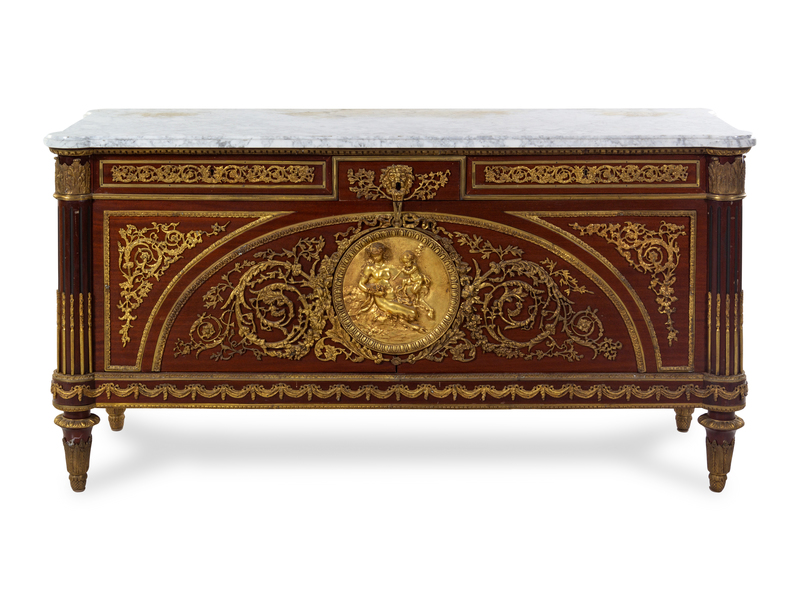 A Louis XVI Style Gilt Bronze Mounted Mahogany Commode a Vantaux