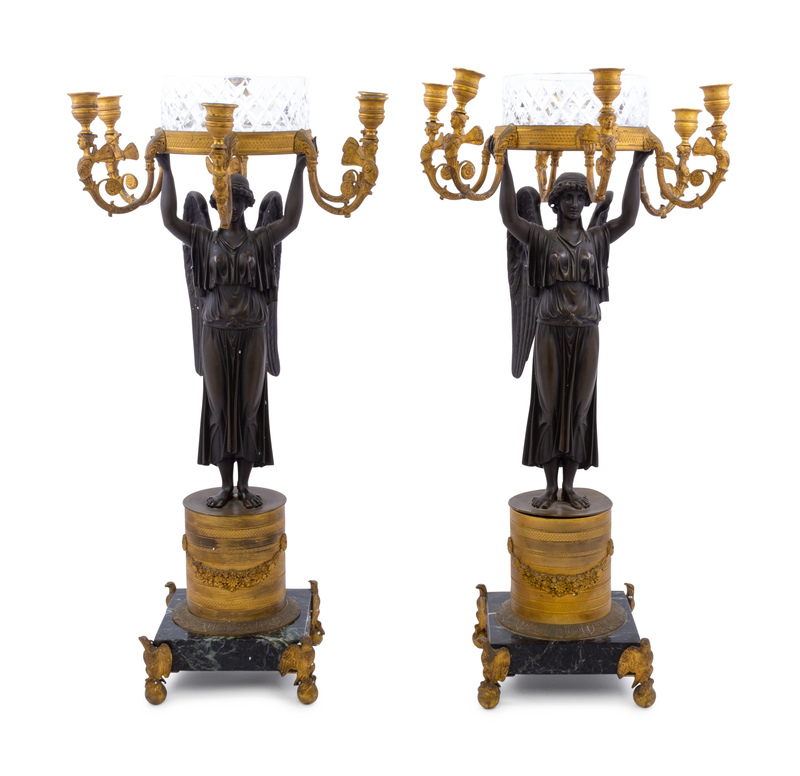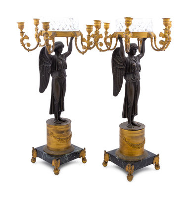A Pair of Empire Gilt and Patinated Bronze Six-Light Figural Candelabra