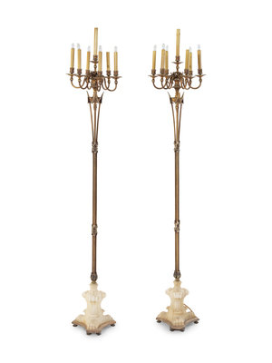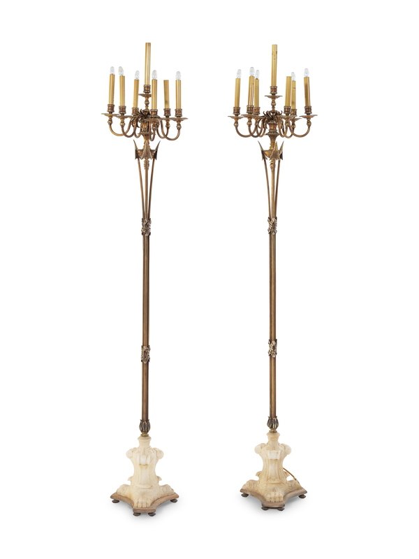 [WITH SILK SHADES] A Pair of Neoclassical Brass and Alabaster Torcheres