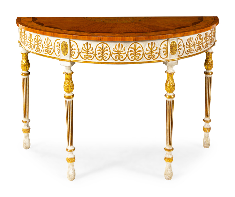 A George III Style Marquetry, Painted and Parcel Gilt Console Table