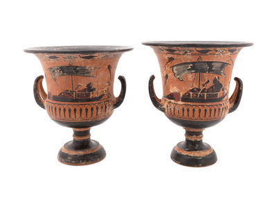 A Near Pair of Greek Black-Figured Style Pottery Urns